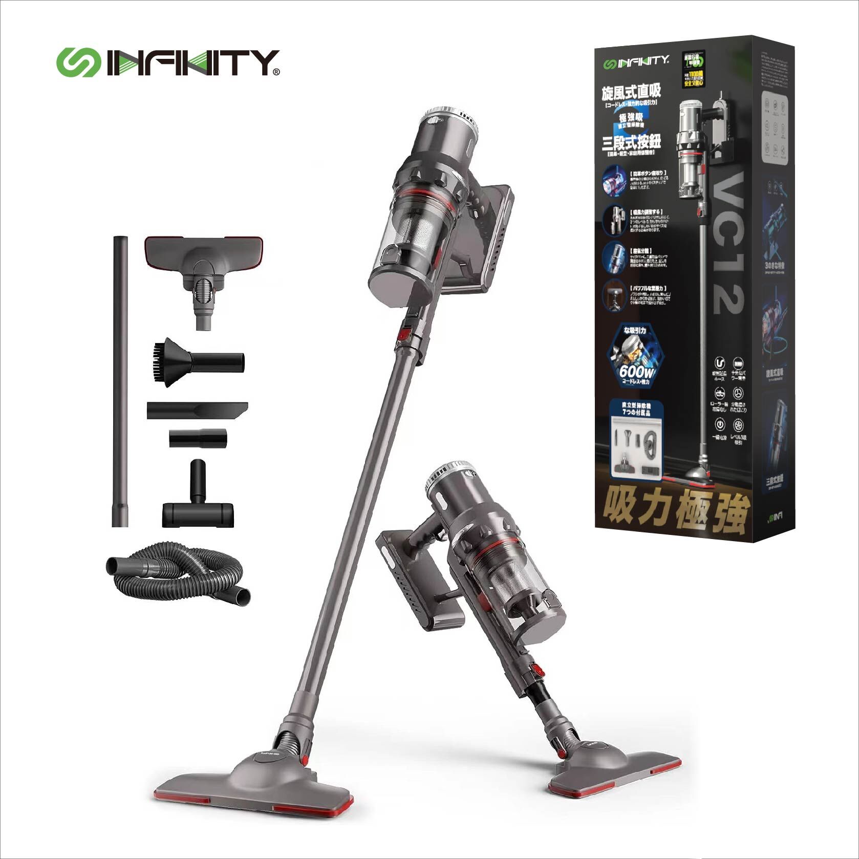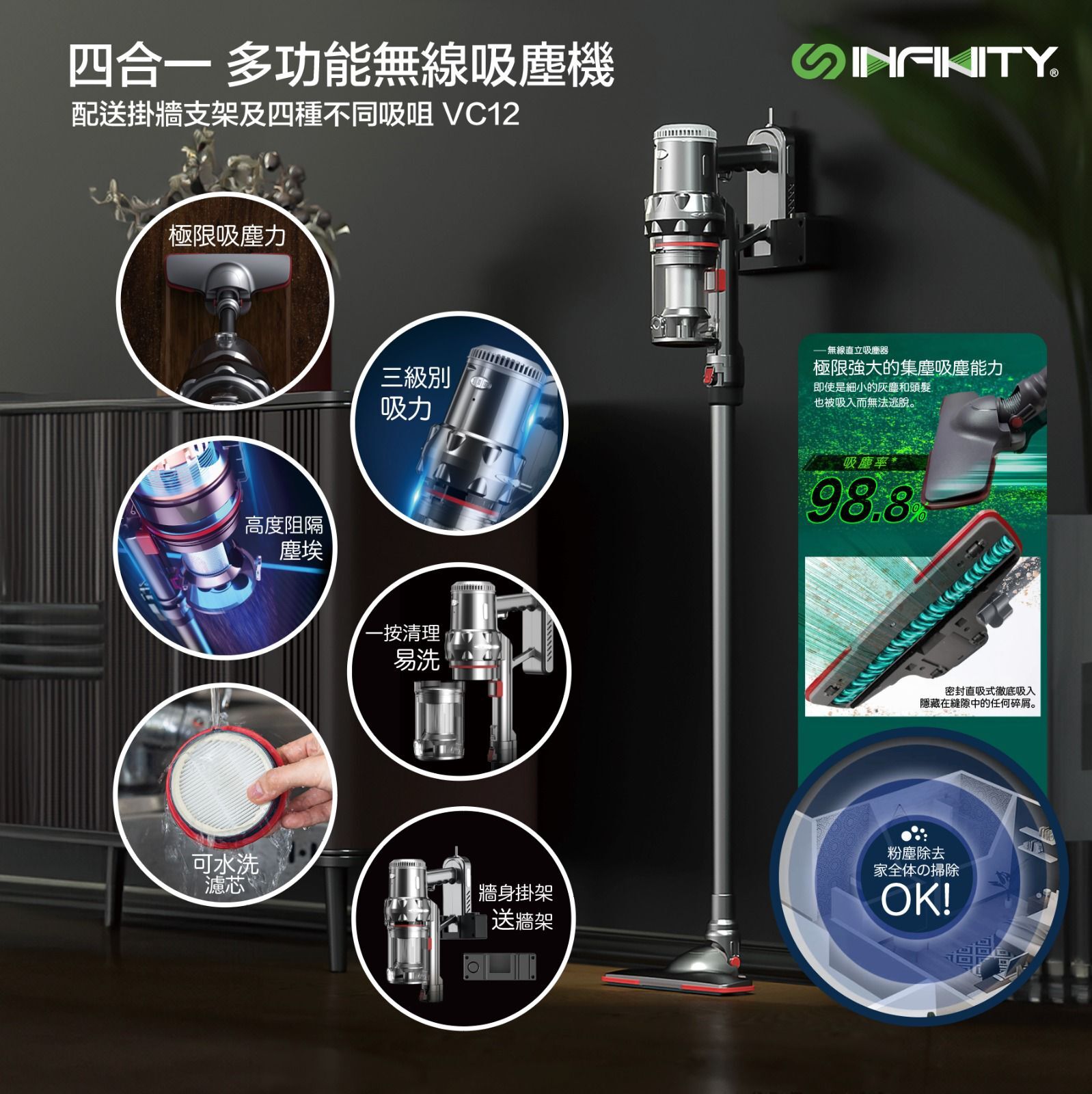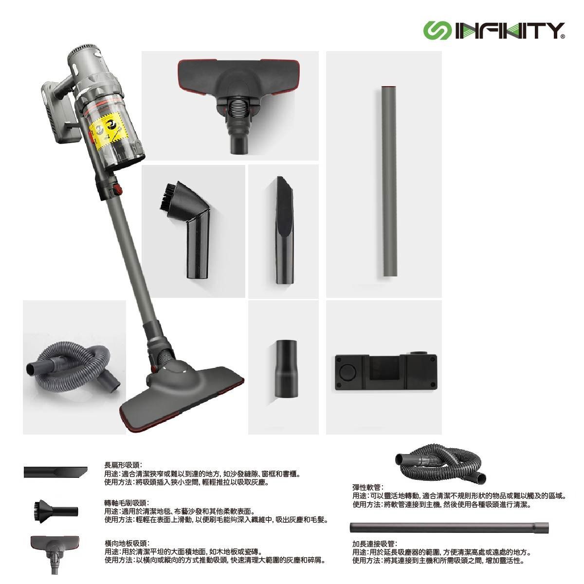 INFINITY四合一多功能無線吸塵機, 多重旋風過濾產生強勁離心力, 提供11000Pa強大吸力, 可續航長達50分鐘, 3段吸力選擇,配送掛牆支架及四種不同吸咀,配合不同清潔任務