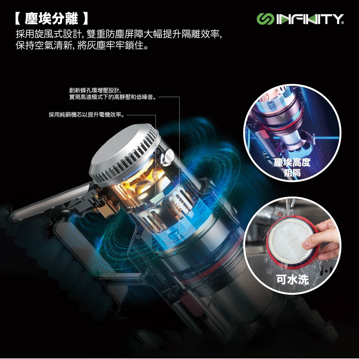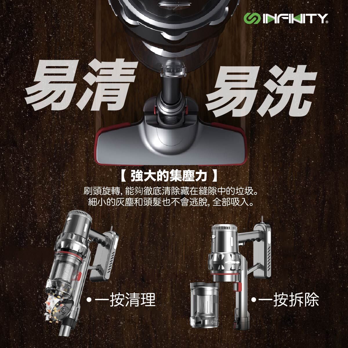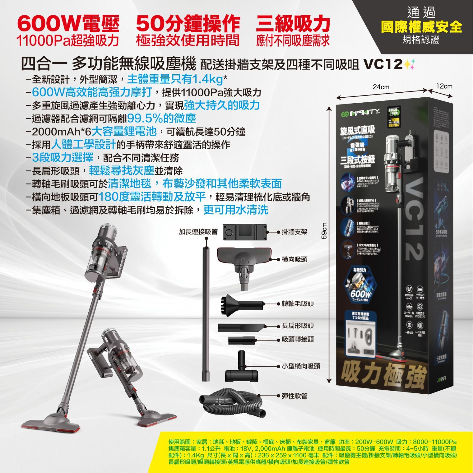 INFINITY四合一多功能無線吸塵機, 多重旋風過濾產生強勁離心力, 提供11000Pa強大吸力, 可續航長達50分鐘, 3段吸力選擇,配送掛牆支架及四種不同吸咀,配合不同清潔任務